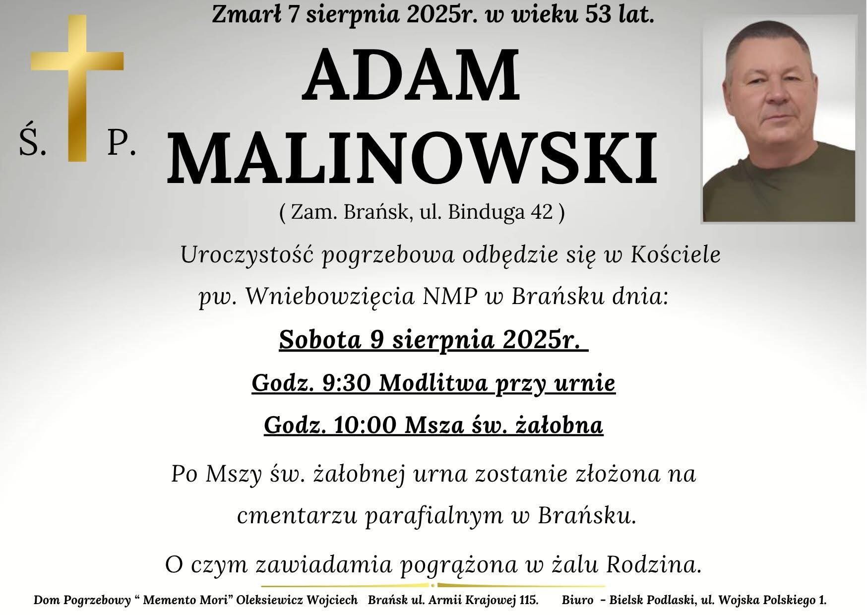 Z głębokim smutkiem i żalem informujemy o odejściu śp. Adama Malinowskiego, wieloletniego i oddanego pracownika Urzędu Miasta Brańsk. Przez 27 lat swojej służby z zaangażowaniem i pasją działał na rzecz lokalnej społeczności, pozostawiając trwały ślad w pamięci wszystkich, którzy mieli okazję go poznać.
