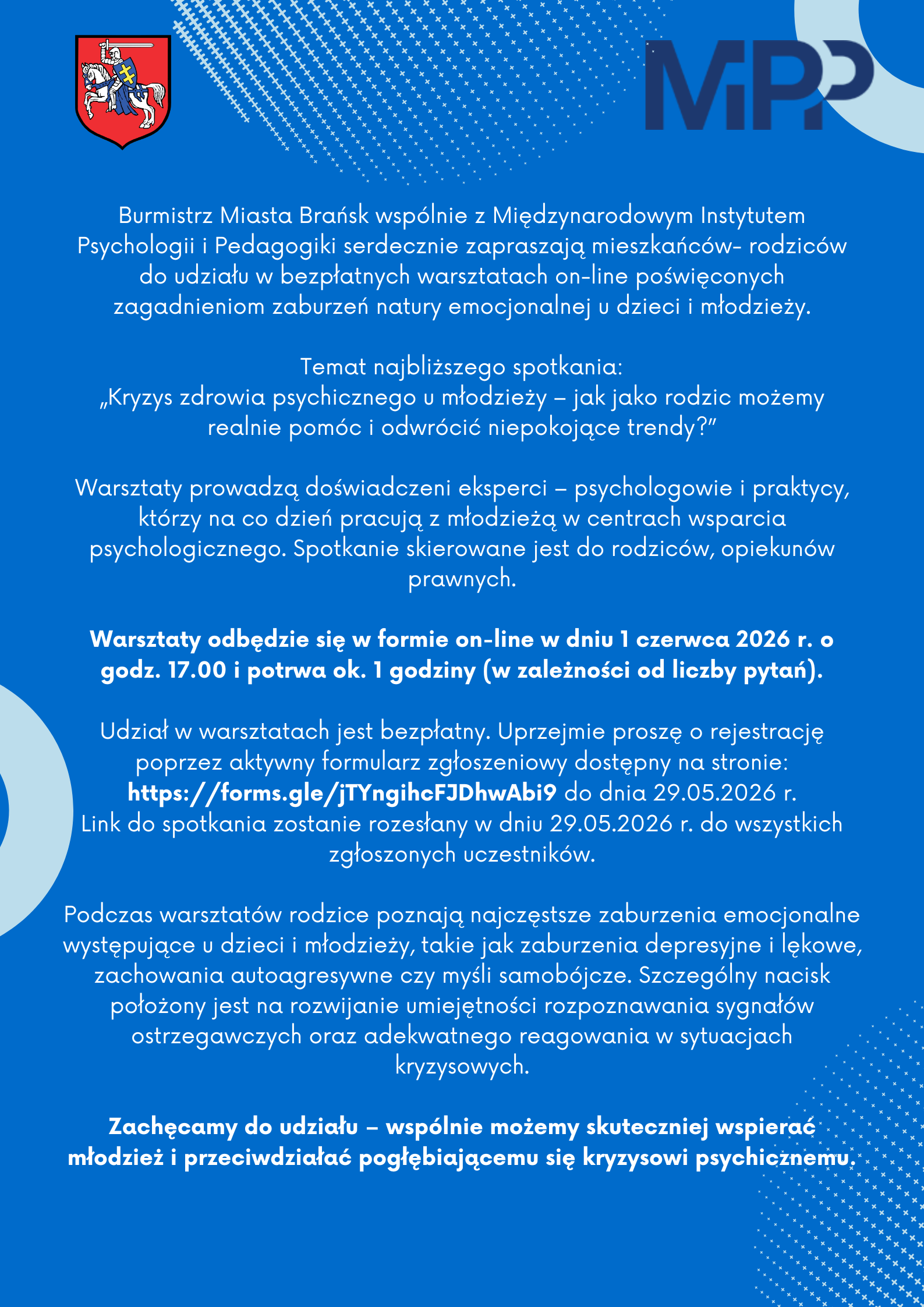 Burmistrz Miasta Brańsk wspólnie z Międzynarodowym Instytutem Psychologii i Pedagogiki serdecznie zapraszają mieszkańców- rodziców do udziału w bezpłatnych warsztatach on-line poświęconych zagadnieniom zaburzeń natury emocjonalnej u dzieci i młodzieży.